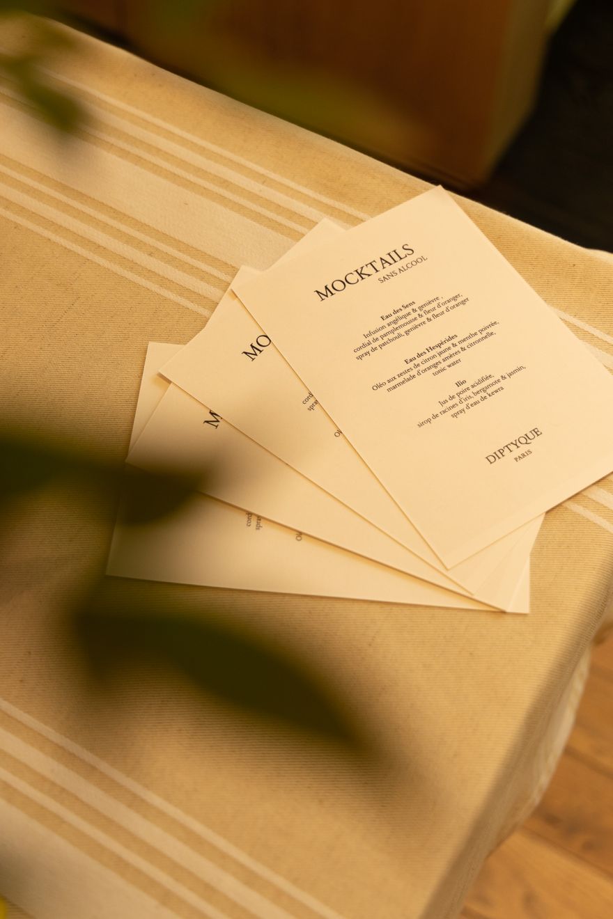Pour sublimer la collection estivale de DIPTYQUE, NMP a créé une carte exclusive de mocktails, inspirée des fragrances emblématiques de la maison.